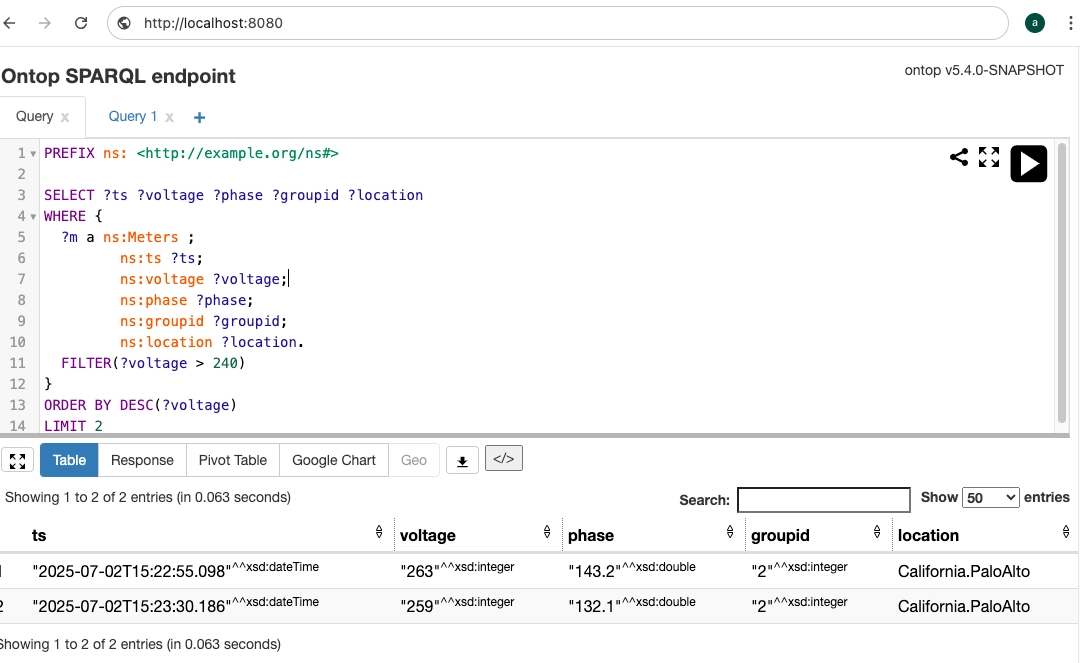 启动 Ontop 服务,打开浏览器进入 SPARQL 查询页面,就能看到时序数据“说话”的样子了。