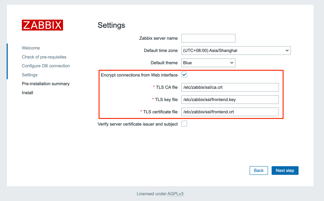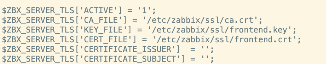 新版本中Zabbix前端与Zabbix server通行支持了TLS加密,可在zabbix server配置文件中配置TLS相关配置即可