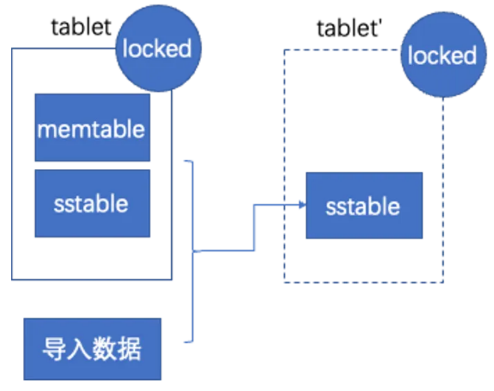 例如下图中 tablet 是原表的 tablet,tablet'是 hidden table 的 tablet,旁路导入会把原表的memtable、sstale,以及导入的数据一起归并到新的 hidden table 里。
