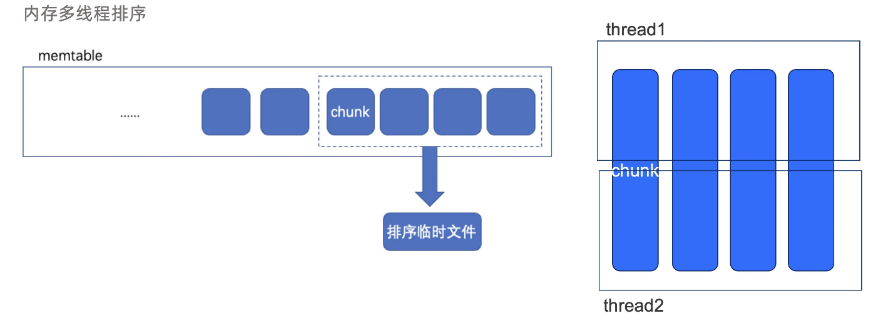 - 对于有主键表,那就不得不按照主键进行排序了,如果输入的数据已经是有序的(例如 csv 文件中的数据就有序),还提供了一个选项,支持用户通过指定要导入的数据是否有序来决定能否进行优化,如果已经有序,内部就只会做归并排序。完全无序时才会走完整的排序流程,无序时为了充分利用内存资源,会对数据进行一个归并的外排,首先先利用最大可用内存对数据进行排序,然后落盘,最后再对磁盘上的各个有序的数据文件进行一个多线程的归并排序,这样不仅可以充分利用内存资源,还可以有效减少落盘的次数。