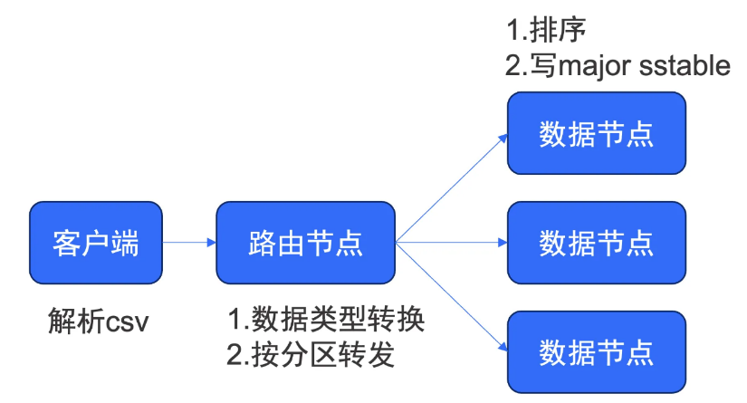 例如通过 load data 命令进行旁路导入,整体的数据流向是:类型转换、根据分区键转发到对应节点、在节点上按需进行排序,最后写入 major sstable。