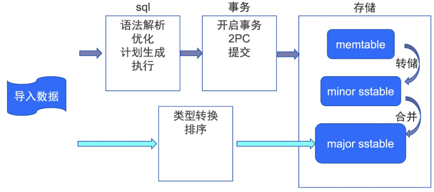 - 下方的浅蓝色箭头所示旁路导入路径主要是对导入的数据进行类型转换(按需),然后按照主键进行排序(按需),最后将排序后的数据直接写入到major sstable 中。