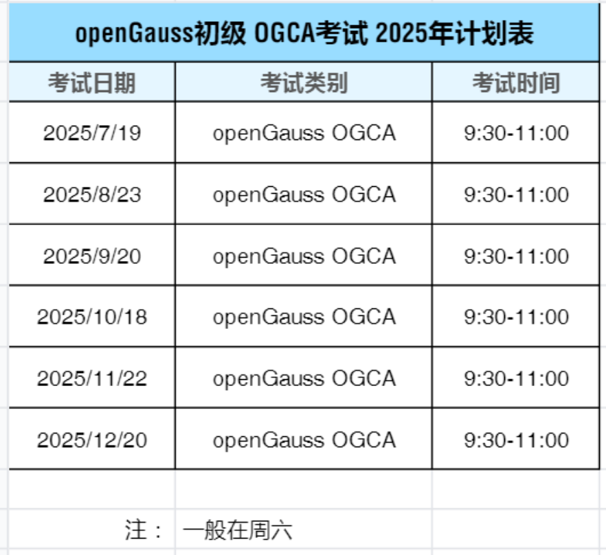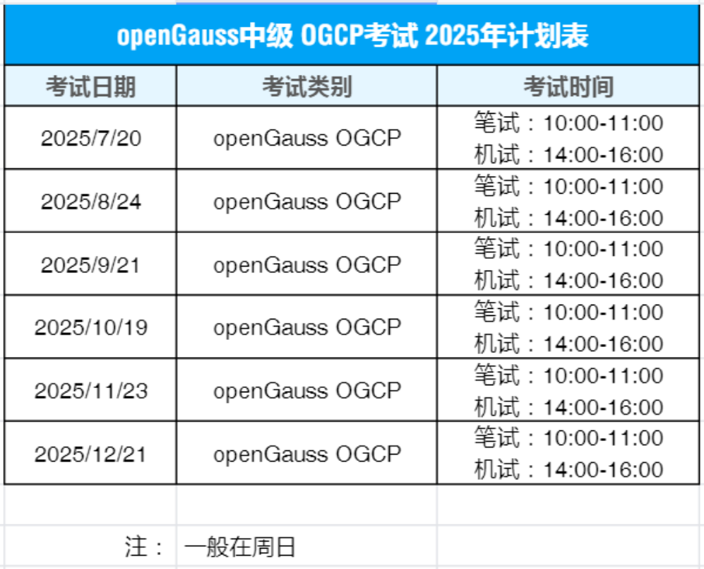 墨天轮 2025年openGauss 认证考试下半年考试时间 如下。考生需提前网上预约考试。