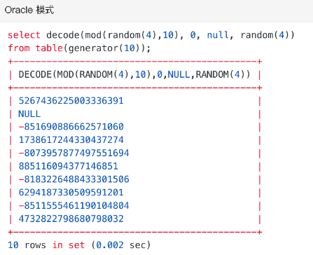 在数据集中掺入 NULL 值,常能有效暴露一些潜在 bug。MySQL 模式中可以用 if 来实现在随机数中掺 NULL,Oracle 模式下,可以用 decode 来实现。下面的例子里,都以 10% 的概率生成 NULL 值: