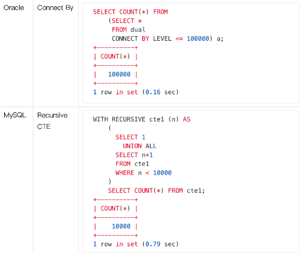 - 多行数据生成时,需要用 CONNECT BY 或 CTE,它们不仅语法复杂,而且数据行数较多时存在性能问题
