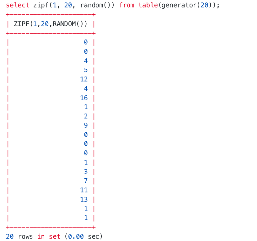 insert into t1 select zipf(1, 20, random()) from table(generator(20));查看所生成的随机数