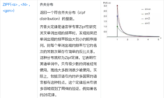 ZIPF(<s> , <N> , <gen>) | 齐夫分布,返回一个符合齐夫分布(zipf distribution)的整数。 |