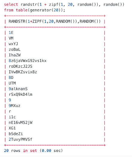 insert into t1 select randstr(1+zipf(1, 20, random()), random()) from table(generator(20));查看所生成的随机数