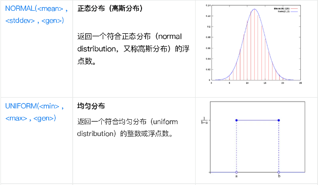 UNIFORM(<min> , <max> , <gen>) | 均匀分布,返回一个符合均匀分布(uniform distribution)的整数或浮点数。 |