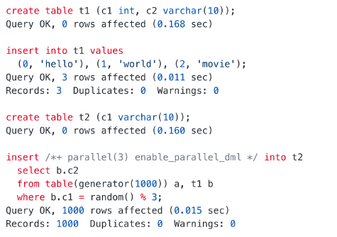 insert /*+ parallel(3) enable_parallel_dml */ into t2 select b.c2 from table(generator(1000)) a, t1 b where b.c1 = random() % 3;说明:由于上一步中插入单词时使用了动态随机筛选条件(random() % 3),导致查询出的表数据行数可能会有差异,请以实际查询结果为准。
