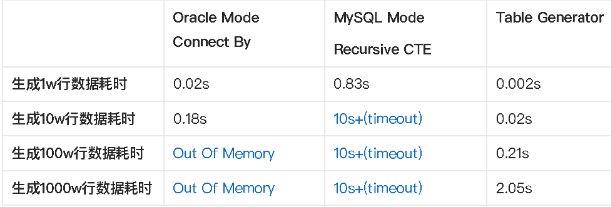 在 OceanBase 中,对比了 Connect By、Recursive CTE 和 Table Generator 生成行数据性能,每行包含一列整数。生成 1000 万行数据,Table Generator 只需 2 秒,完全满足日常需求。