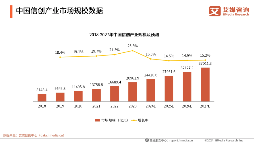 艾媒咨询《2024年中国信创产业发展白皮书》报告:2023年中国信创产业规模达20961.9亿元,2027年有望达到37011.3亿元,中国信创市场释放出前所未有的活力。