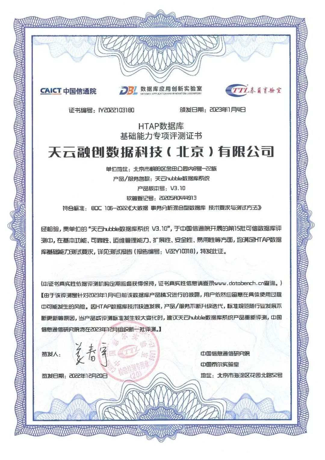 天云数据的Hubble数据库是国内领先的HTAP(混合事务分析处理)数据库,具备高性能、高可用、高稳定、高安全等核心特性,能够满足金融、电信、政务等行业对数据处理的高标准需求。是中国信通院HTAP数据首批通过三家通测评单位之一。