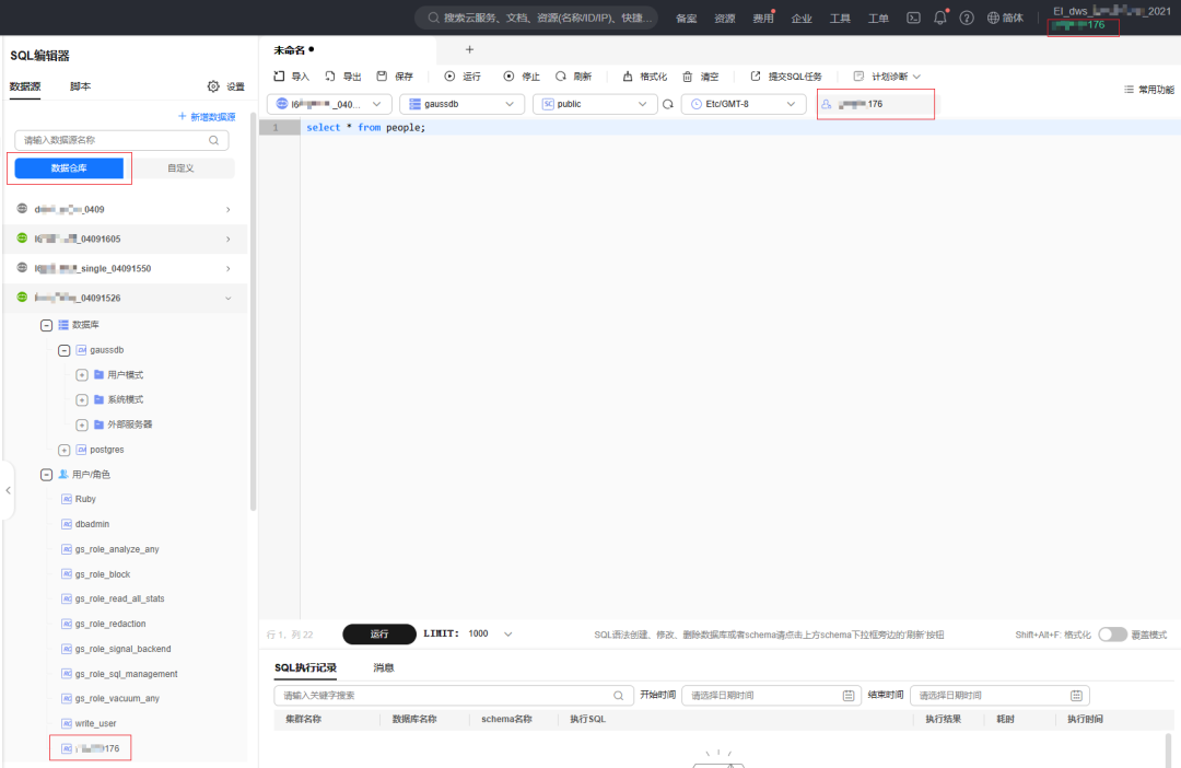 左边有两个面板,“数据仓库”和“自定义”,数据仓库是IAM子用户登录,只支持拥有DWS Database Access角色权限的子账号。符合条件后可选择一个集群名称单击打开,即连接上集群数据库可进行操作。