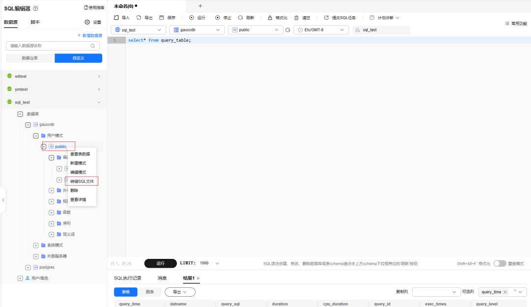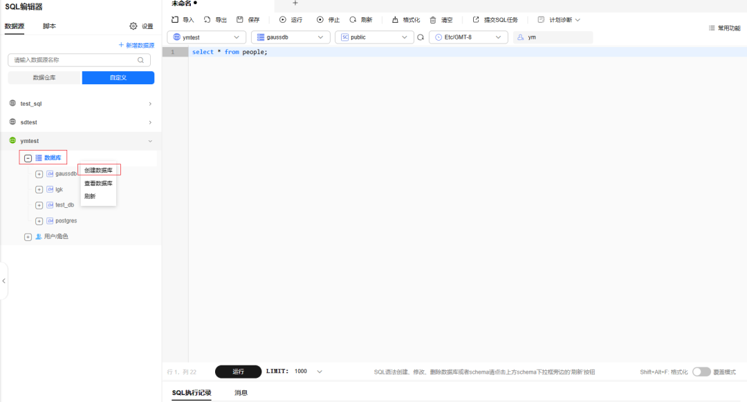 切换至“数据源”面板,登录需要提交SQL任务的数据源,选择编辑框面板上方对应的数据库和模式。