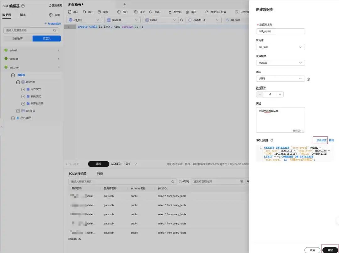 SQL预览:可单击“点击预览”显示创建数据库SQL语法。