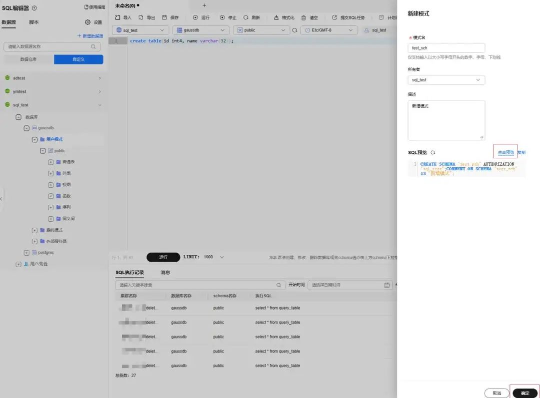 SQL预览:单击“点击预览”显示新建模式SQL语法。