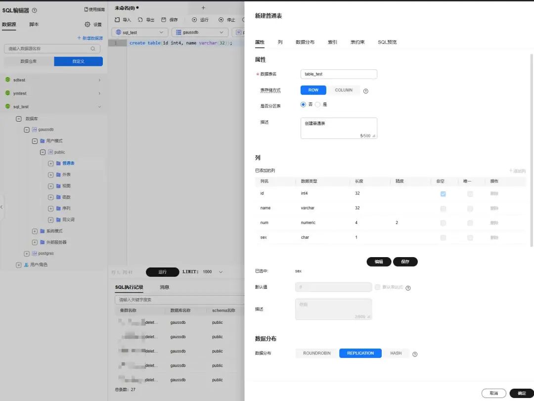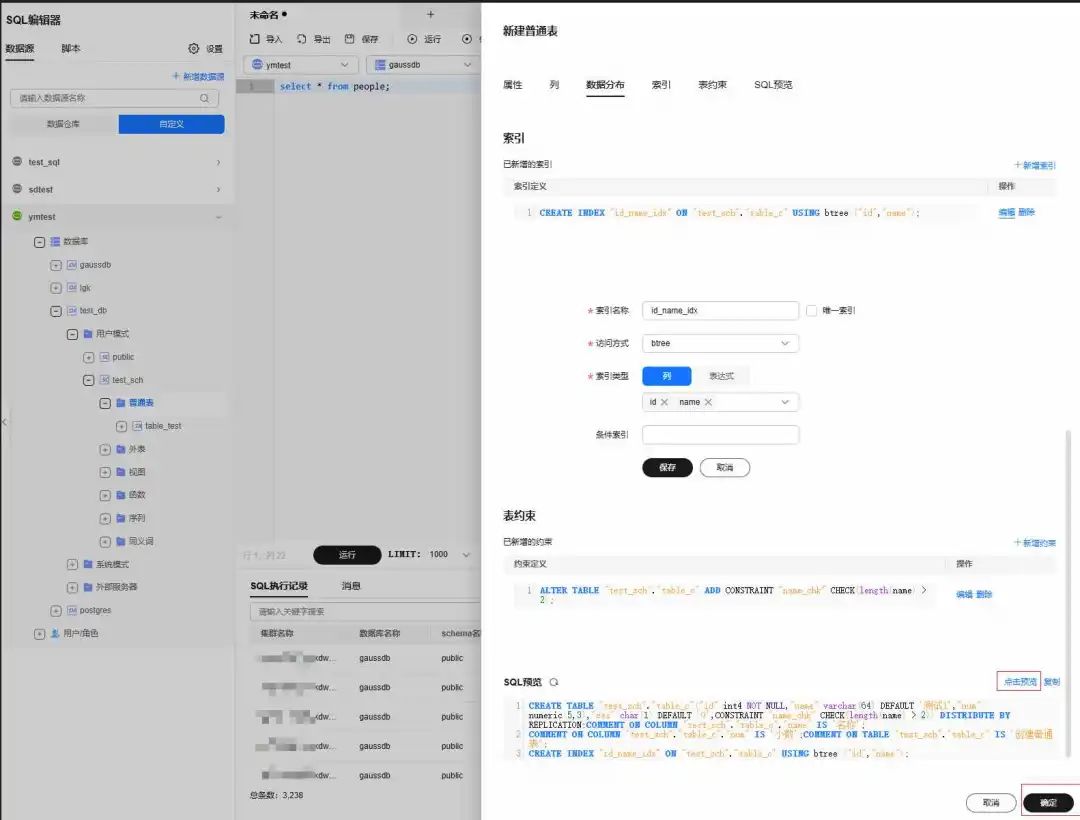 右键普通表名称,再单击“新建普通表”可新增一个表,新增普通表的弹窗包含属性、列、数据分布、分区、索引和约束等选项,其中属性和列字段是必填的选项。可单击SQL预览,查询创建表的SQL语句。