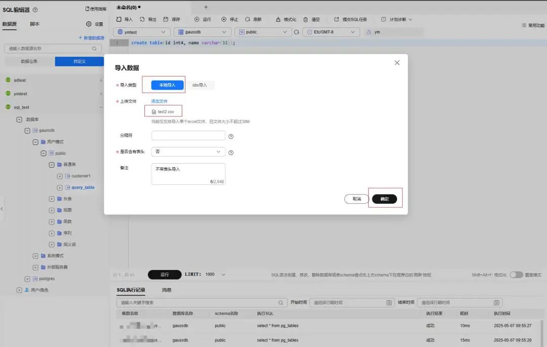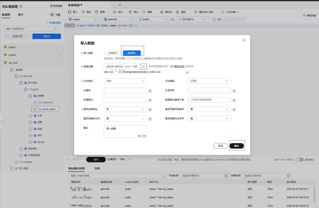 obs导入:从OBS桶文件中选择文件,也可以选择目录,支持CSV和TEXT文件类型。填写OBS桶导入需要创建外表的一些参数,通过OBS外表将OBS桶文件写入到选择的普通表中,需要注意的是,实时数仓(单机部署)仅8.2.0.100及以上集群版本支持通过OBS文件导入功能。