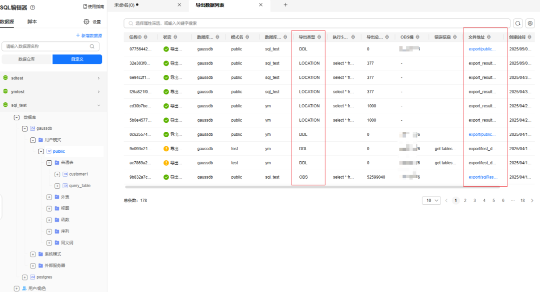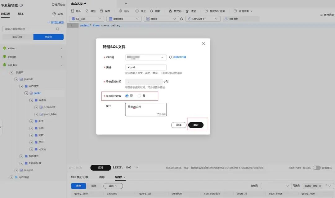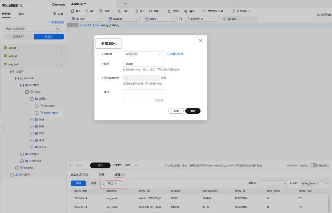 全量导出:将查询SQL的所有结果导出到指定的OBS桶下的路径中,默认为csv文件。