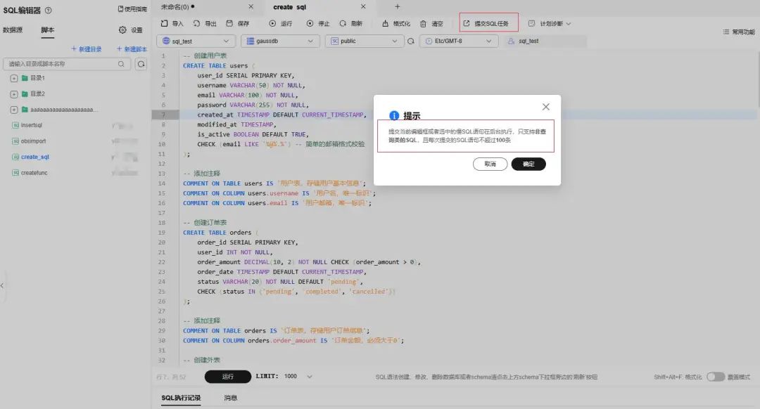 说明:每次提交的非查询类SQL语句不可超过100条,同一个用户下最多支持5个正在执行的SQL任务。