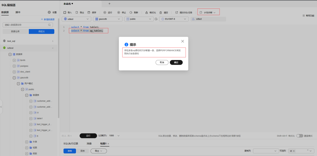 说明:每次只能诊断单条查询类SQL语句,选择多条,默认对第一条进行诊断,选择PERFORMANCE诊断会真实执行输入的SQL进行返回结果。