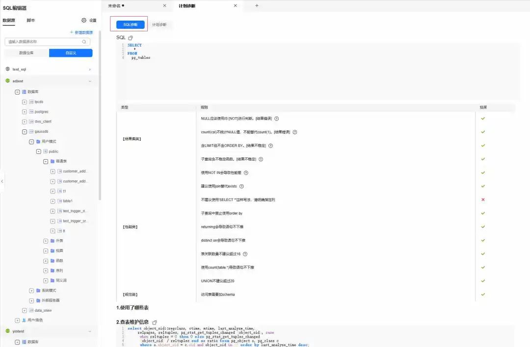 单击“SQL诊断”显示SQL语句的格式化以及诊断项。