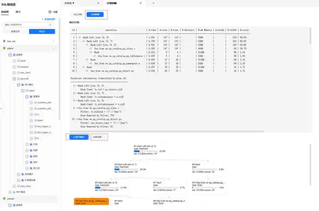 切换“计划诊断”显示查询SQL的计划树形节点以及计划诊断结果。