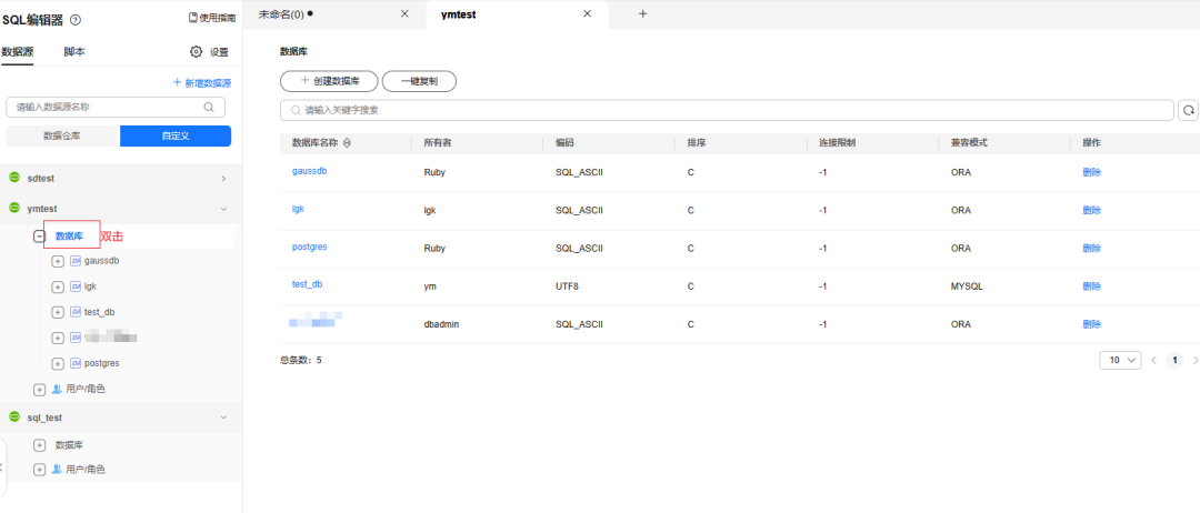 切换至“数据源”面板,数据源连接成功后,右键数据库名称,再单击“创建数据库”按钮。