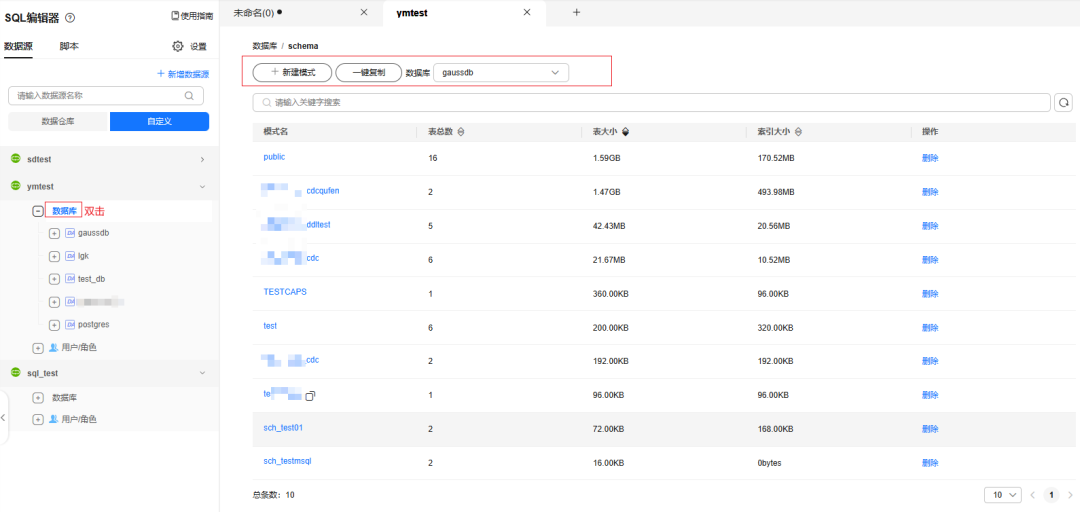 单击数据库列表中某一个数据库名称,进入到schema列表,可以查看表总数,表总大小和索引大小信息。
