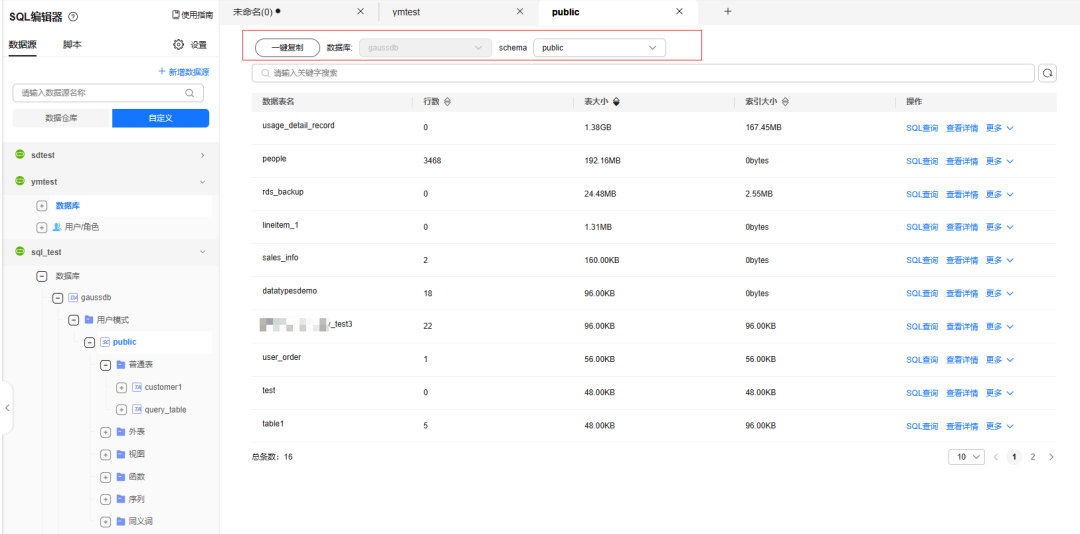 单击schema列表中某一个schema名称,进入到普通表列表,可以查看表行数,表大小和索引大小等信息。