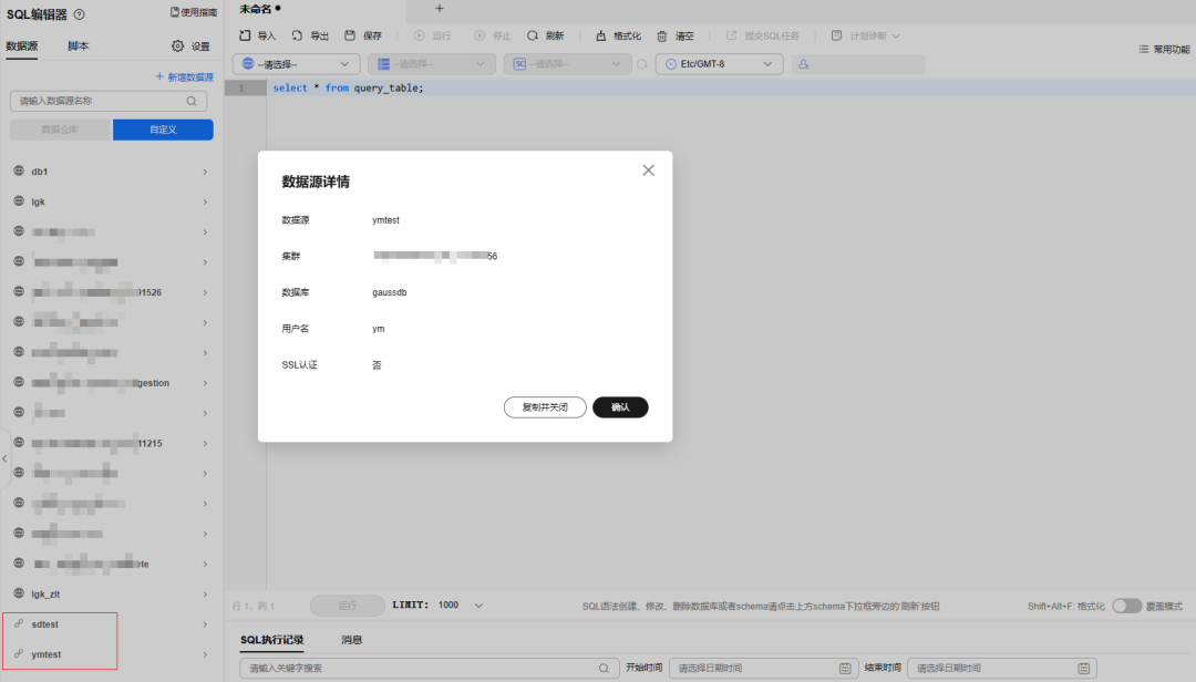 说明:编辑器支持IAM用户将自己创建的自定义数据源共享给同租户下的其它IAM用户,其它用户可以通过被分享的连接登录集群数据库,需要注意的点是,如果数据源没有保存密码,即使分享给其它用户,那么登录连接时也需要输入密码,并且被分享的数据源无法被(被共享人)再次共享。
