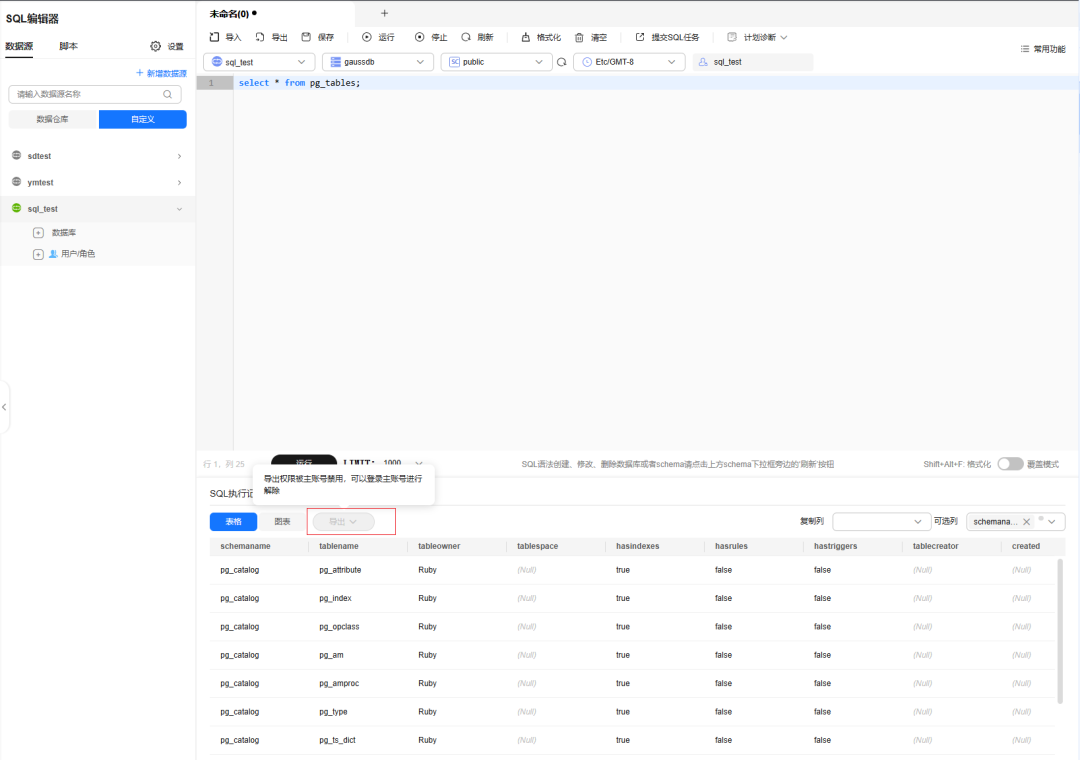 切换至“数据源”面板,登录需要导出数据的数据源,选择编辑框面板上方对应的数据库和模式。