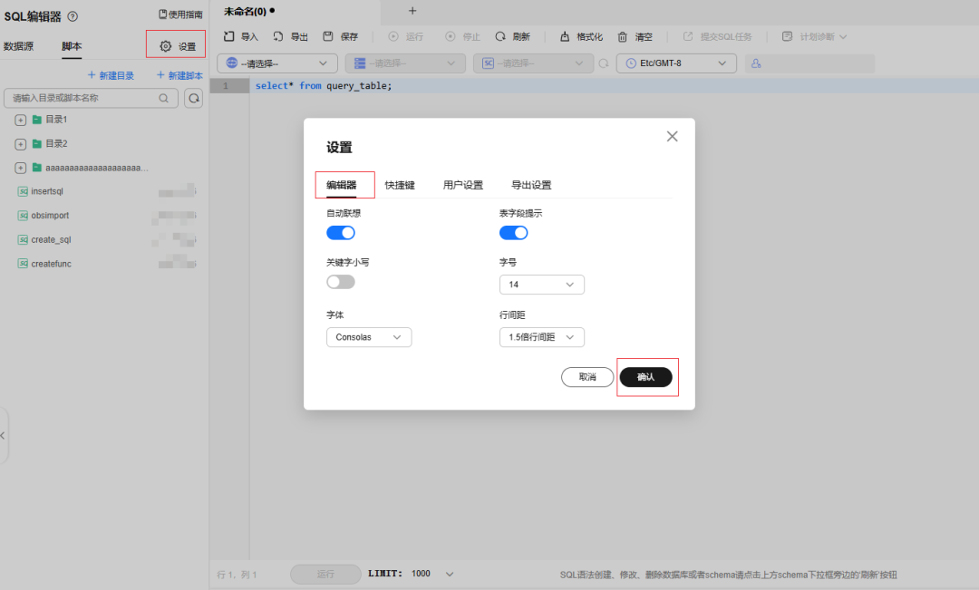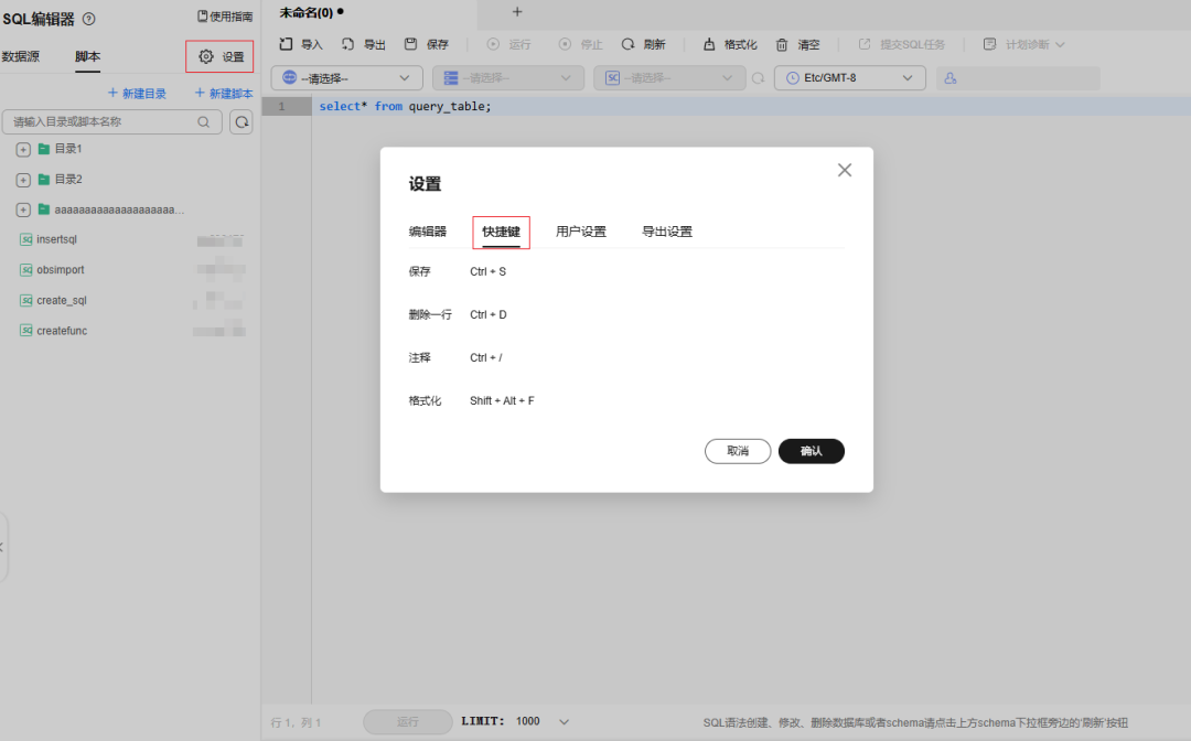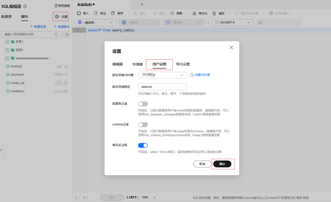 用户设置 | 针对OBS进行设置,可以全局指定OBS桶,在这个桶下面创建一个文件目录后,脚本默认会保存到该OBS桶的文件夹下面,无需再选择。可以设置数据库和schema权限过滤,开启开关后,根据当前的数据库用户过滤数据库的create权限以及过滤schema的usage权限。可以设置表列名注释显示开关,开启后,select * from[表名],返回结果时表头会带上列对应的注释信息。 |