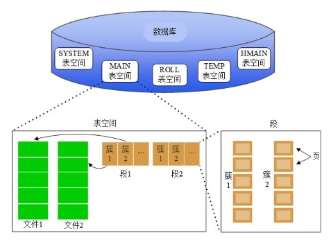DM 数据库为数据库中的所有对象分配逻辑空间,并存放在数据文件中。在 DM 数据库内部,所有的数据文件组合在一起被划分到一个或者多个表空间中,所有的数据库内部对象都存放在这些表空间中。同时,表空间被进一步划分为段、簇和页(也称块)。通过这种细分,可以使得 DM 数据库能够更加高效地控制磁盘空间的利用率。
