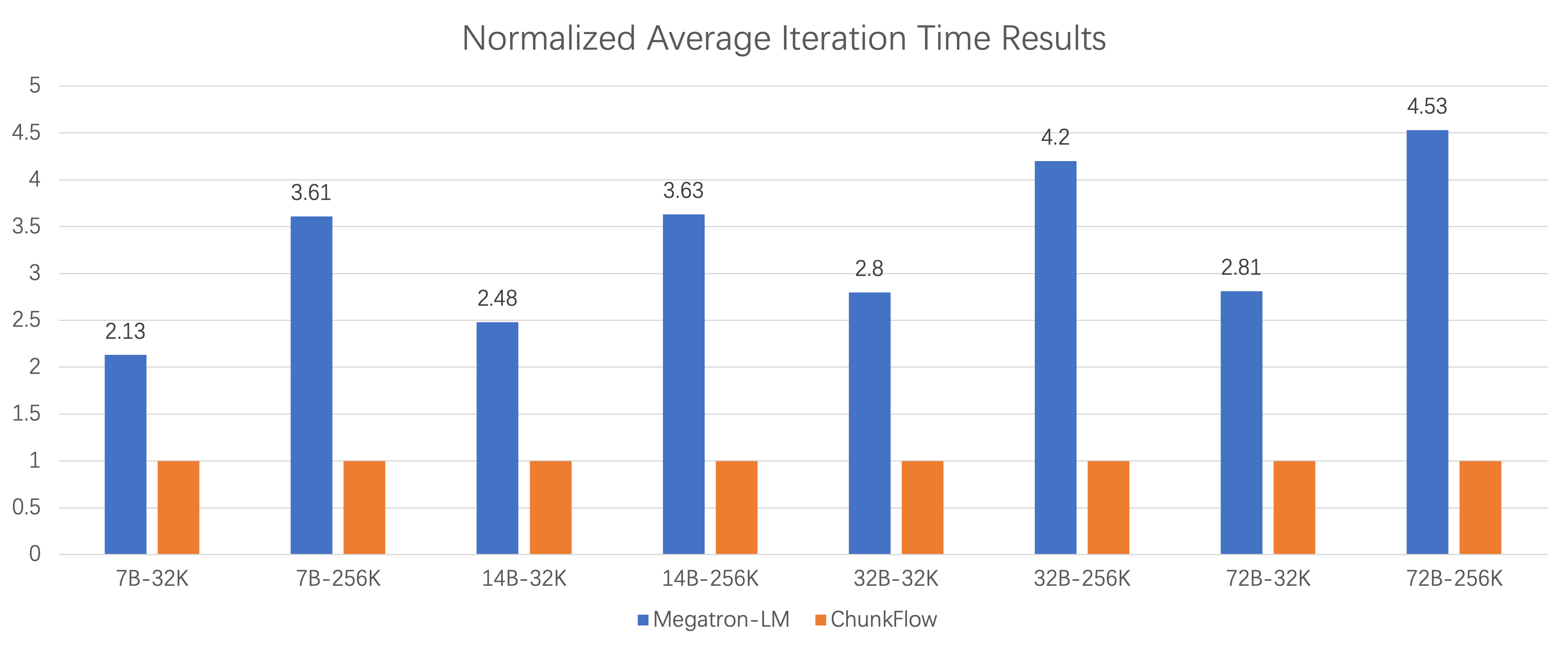 我们在多种尺寸的Qwen2.5系列模型中分别做了文本长度为32K和256K的端到端性能测试,下图展示了ChunkFlow相较于Megatron-LM,训练的端到端性能有最高4.53倍的提升。