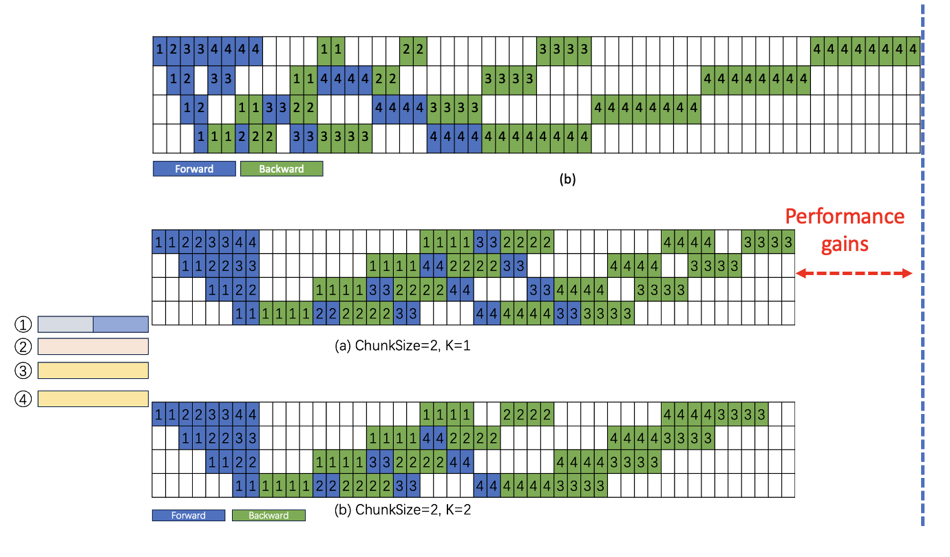 通过ChunkFlow的计算机制,我们能够的到更均衡的流水线切片的处理时间,从而大幅降低流水线并行中的空泡率。同时,由于对长数据的切分,ChunkFlow增加了流水线并行中的微批次数量,进一步提升了流水线并行的性能。