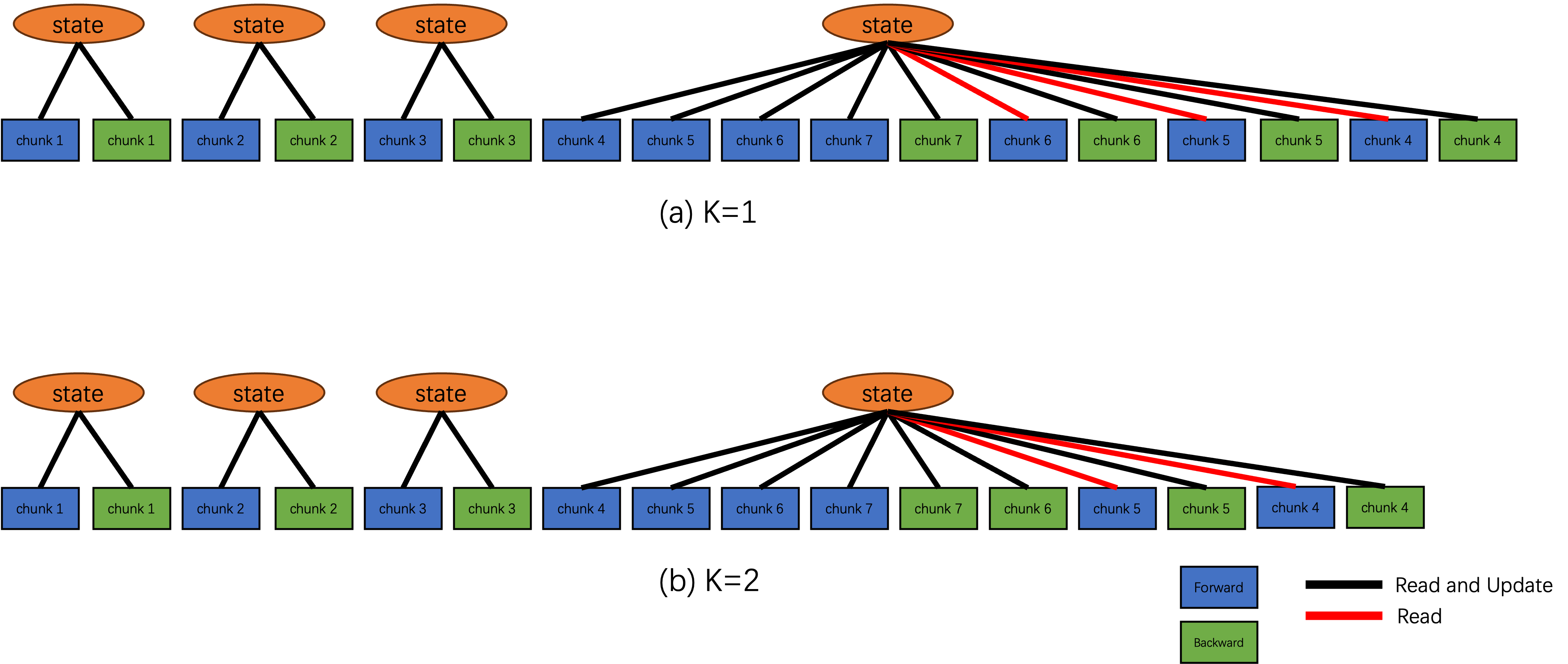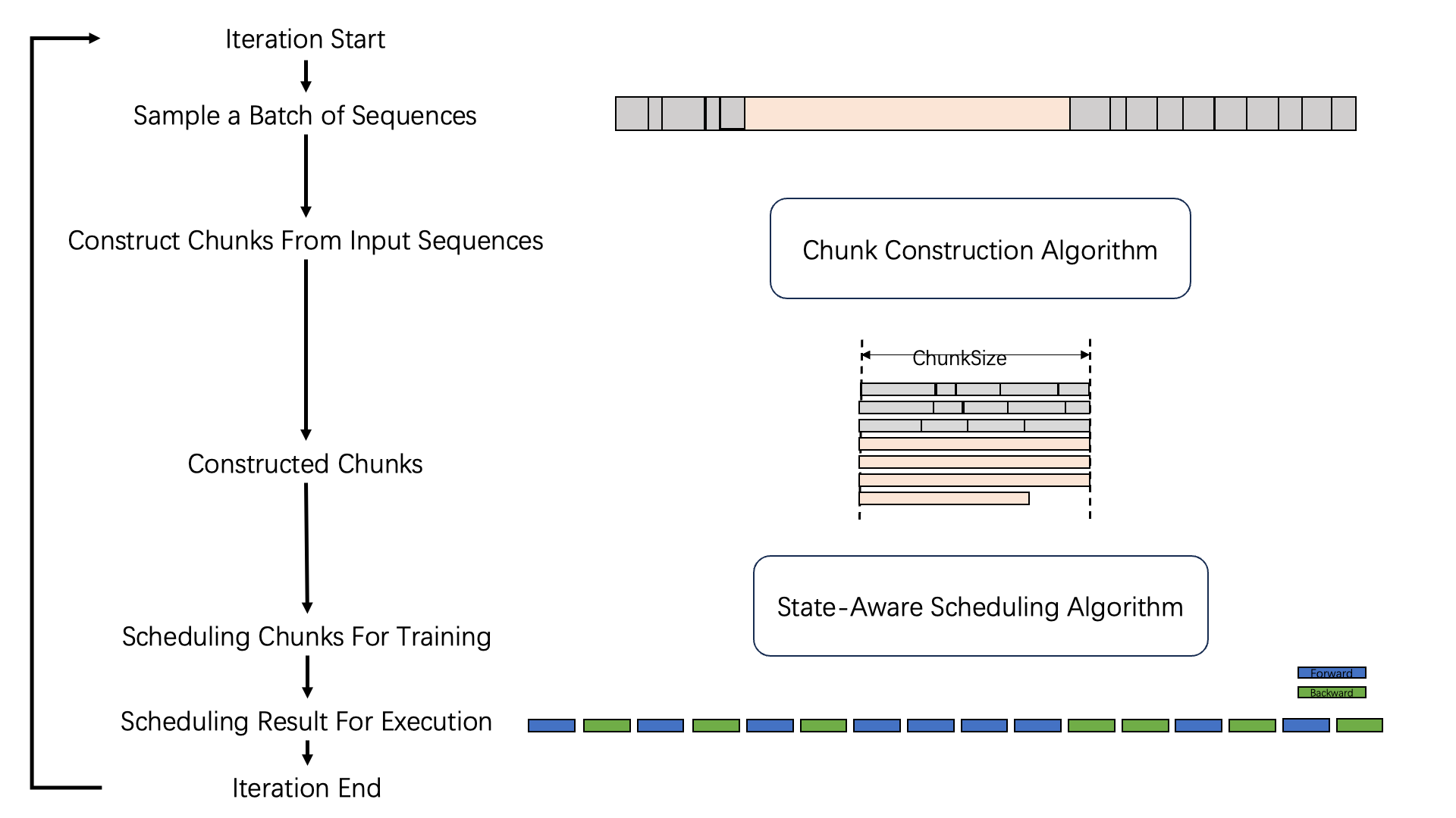 在每个iteration开始采样的到一批训练样本后,通过将短序列拼接、长序列切分,ChunkFlow将数据重新构建成以ChunkSize为单位的训练样本。在训练过程中为了维持计算的正确性和显存控制,ChunkFlow采用了状态感知的调度机制。