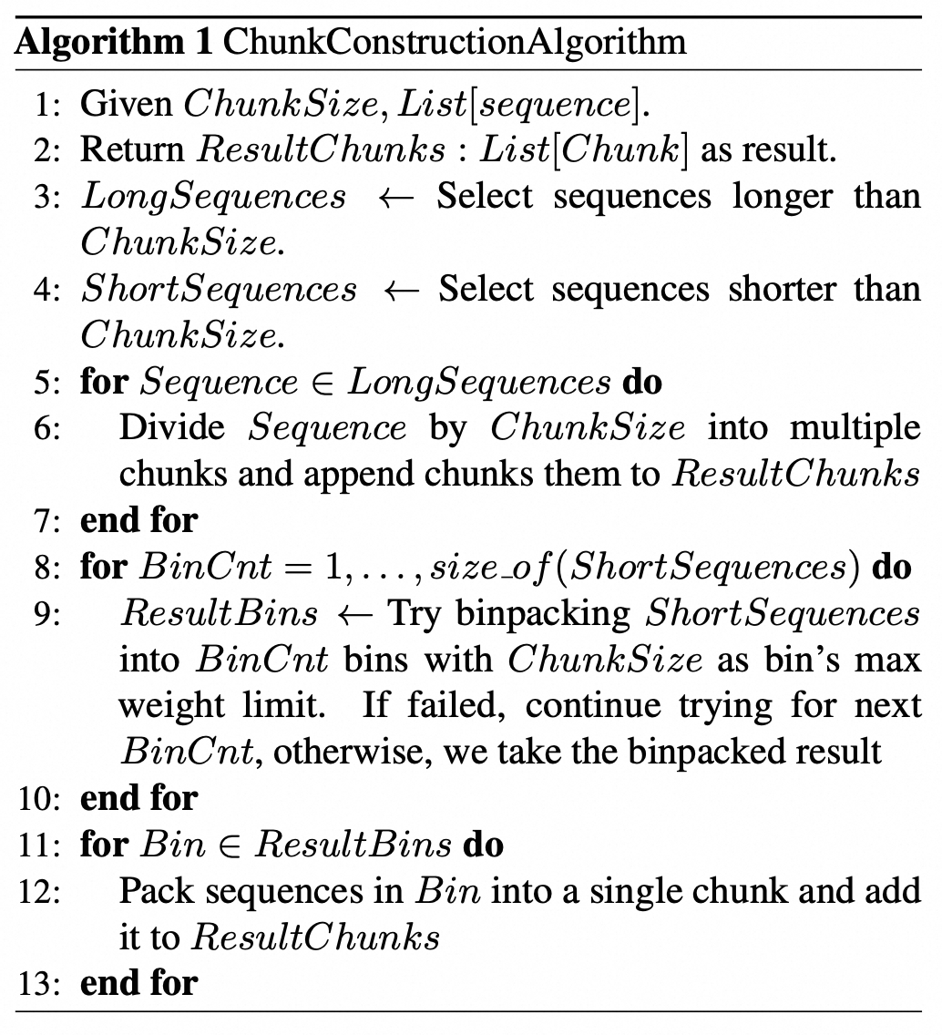 ChunkFlow针对处理变长和超长序列数据的性能问题,提出了以Chunk为中心的训练机制。我们期望训练过程中的内存需求能够与我们设定的固定的ChunkSize成正比,解决在变长数据和超长数据集训练过程中不稳定的内存占用和GPU利用率低下的问题。ChunkFlow重新组织了数据,将短的训练数据做拼接,长的训练数据做切分,把变长的训练数据重新组织成以ChunkSize为大小的形式。如下图所示,Algorithm 1展现了训练Chunk构建的过程。