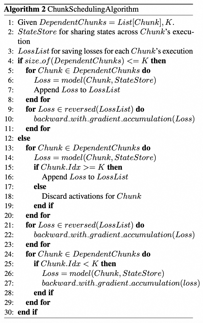 对于拼接的序列,其计算的正确性可以通过注意力掩码来保证,但是对于被切分到各个Chunk的长序列,由于语言模型中注意力机制的因果特性,我们需要仔细的按照顺序去维持计算正确性。为此,我们对于这些相互依赖的Chunk提出了一套调度机制。如下图 Algorithm 2所展示,这个调度机制可以根据内存需求,通过使用重算等显存优化方式调整相互依赖Chunk计算过程中的显存问题。