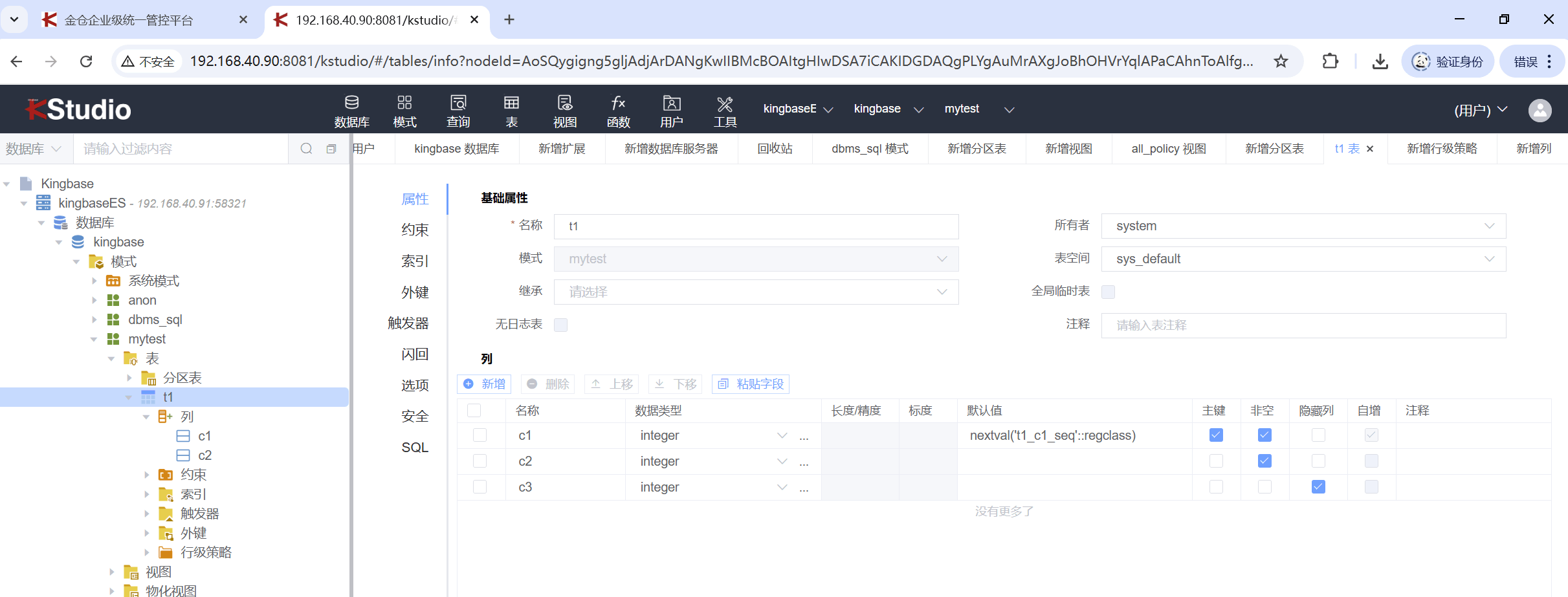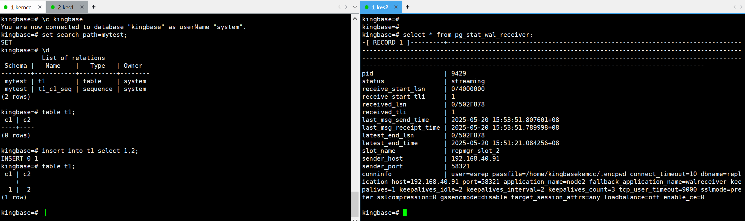 在写节点 KES1 服务器上查看 t1 表,向表 t1 写入数据。KES2 为读节点,确认数据已经同步。