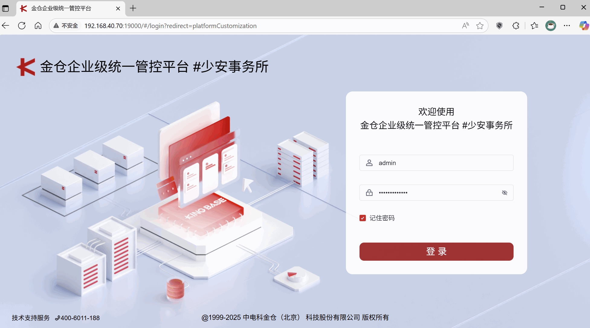 KEMCC 平台启动后,用户可以使用 Chrome 浏览器打开登录页。平台支持自定义登录页,用户可以根据自身需求替换 LOGO、背景图、平台名称等信息,从而定制个性化登录页面。