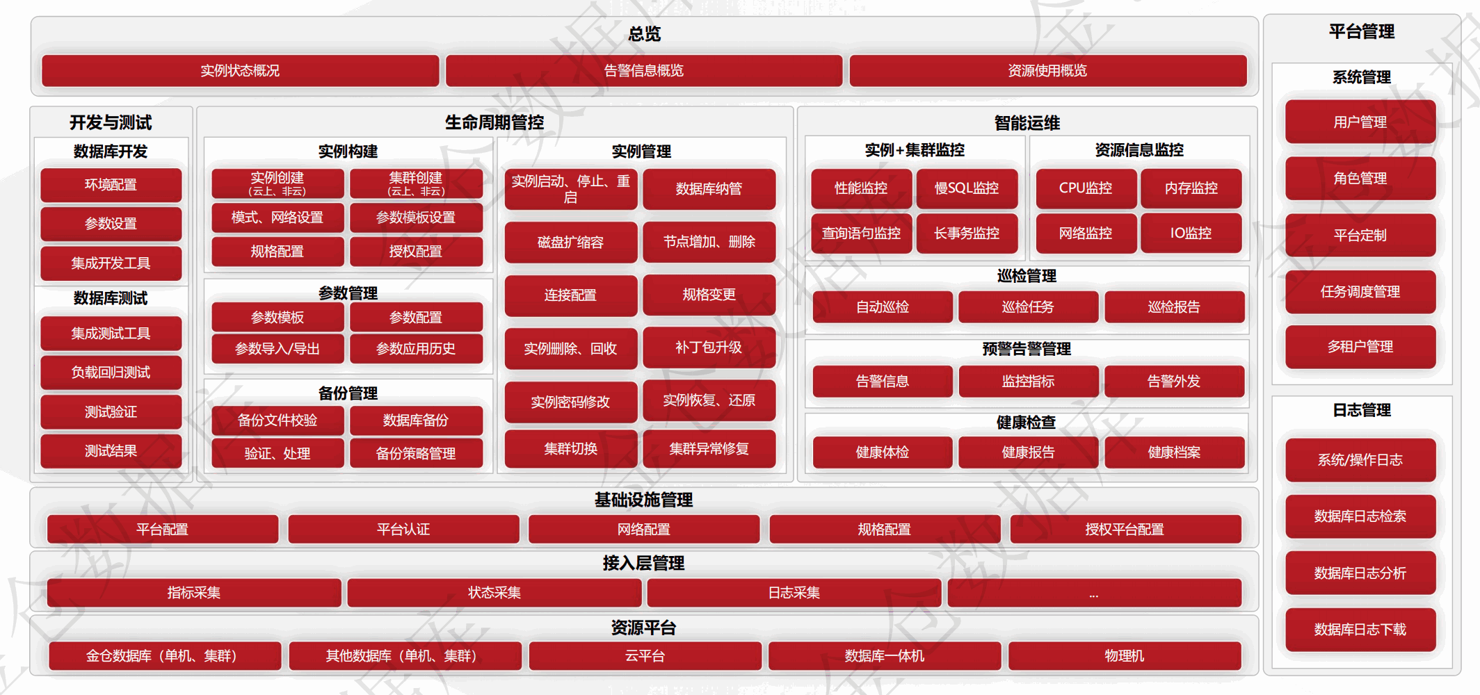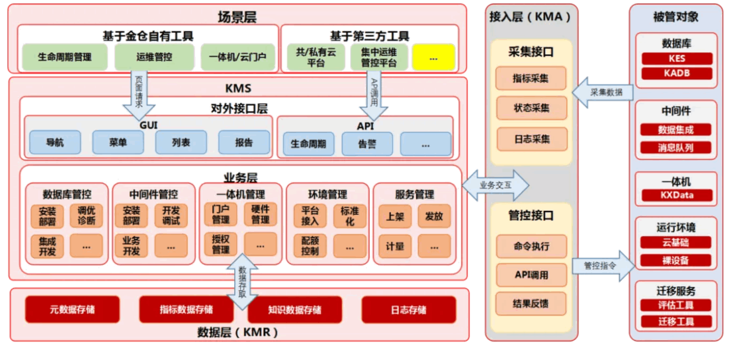 KEMCC 平台的逻辑架构设计精巧,提供从数据库安装部署到实例管理的全生命周期管理能力,包含资源平台、接入层、IaaS 管理、PaaS 管理等多个关键组成部分。提供智能运维能力,包括集群监控、巡检管理、告警管理等功能。集成 KStudio 数据库开发工具,为数据库开发人员、DBA 提供数据库开发、测试等功能支撑。