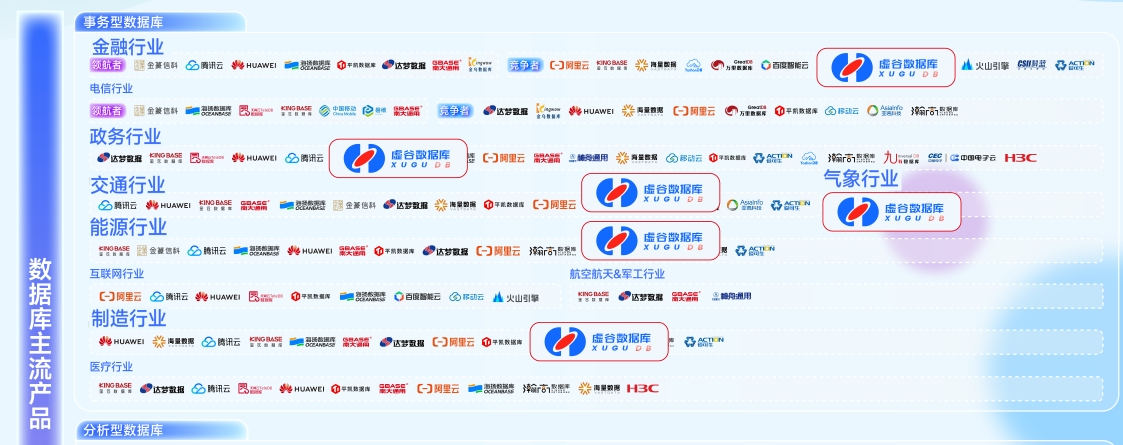 本次图谱首次按垂直领域细分数据库能力,虚谷数据库作为国产数据库主流产品,在事务型数据库板块表现突出,成功入选金融、政务、气象、交通、能源、制造六大行业。