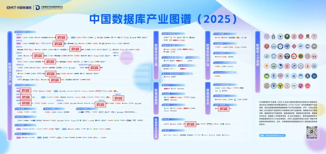 大会期间,中国信通院发布《中国数据库产业图谱(2025年)》。2025年版图谱以事务型数据库和分析型数据库为代表的数据库厂商为核心,延续赋予领航者和竞争者标识,新增典型行业应用情况。