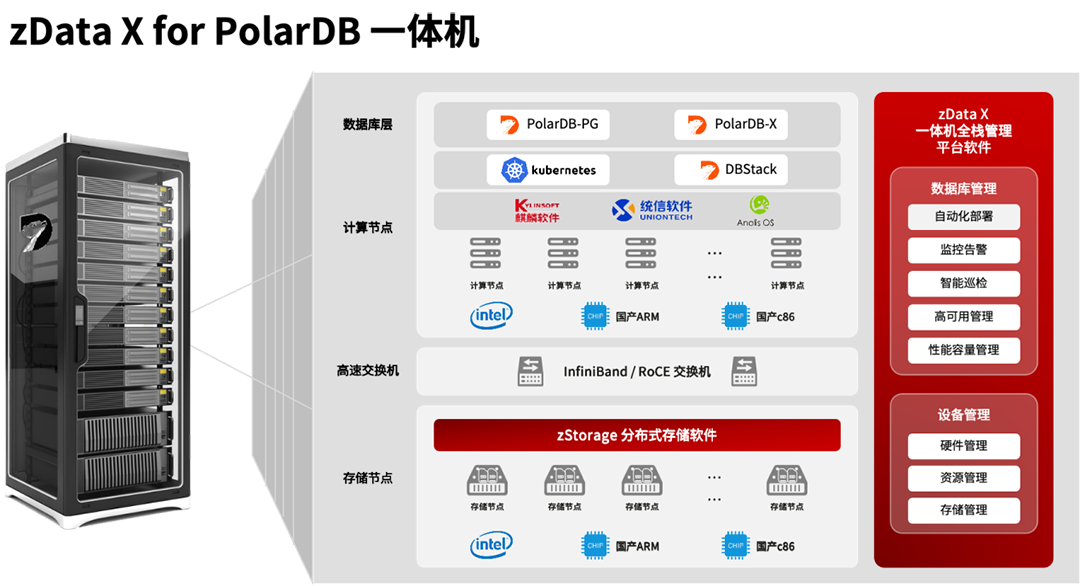 阿里云与云和恩墨的深入合作迈上新台阶!近日,双方强强联手,通过优势互补,正式联合推出高性能、高安稳、高可用的 zData X for PolarDB 一体机。这一突破性合作不仅加速了国产数据库生态建设,也为各行业客户提供了全新升级路径,助力数字化转型。全新的 zData X for PolarDB 一体机是云和恩墨在自研数据库一体化承载平台 zData X 的基础上,通过将专为数据库场景而打造的分布式块存储软件 zStorage 和一体机运维管理平台软件,与 PolarDB 产品进行充分适配和调优,而推出的软硬一体的数据基础设施解决方案。该方案还特别针对国产芯片(ARM/c86)和操作系统(麒麟/统信/龙蜥)进行全面性能调优,实现一站式软硬件交付,配合专业的运维管理软件和支持服务,真正做到“开箱即用”,实现全栈国产化环境下的数据库稳定可靠与高性能运行。作为智能的数据技术提供商,云和恩墨拥有涵盖数据库、数据库存储、数据库管理、数据智能的系列软件产品,以及面向国内外主流数据库的第三方管理服务,已为政务、金融、电信、医疗、制造等行业的数千家客户提供支持。其中,zData 数据库一体机产品最早于2015年问世,十年来经过数次迭代演进,现已升级为 zData X,是一款多元数据库一体化承载平台,集成智能运维能力,支持全栈国产化软硬件部署与管理,通过数十项兼容互认证,能够保障多套数据库在高性能稳定运行的前提下,有效降低数据库承载和运维成本。此次双方合作推出的 zData X for PolarDB一体机,融合 PolarDB 与 zData X 的关键技术,旨在解决大规模、高并发环境下数据库性能、稳定性和可用性挑战。值得一提的是,zData X 所具备的运维管理能力,打破运行环境的差异,将硬件、操作系统、虚拟化和数据库统一管理,通过软件内置的运维管理经验,以一体机的形态为用户提供运维管理更加标准化的产品。zData X for PolarDB一体机运维管理界面
