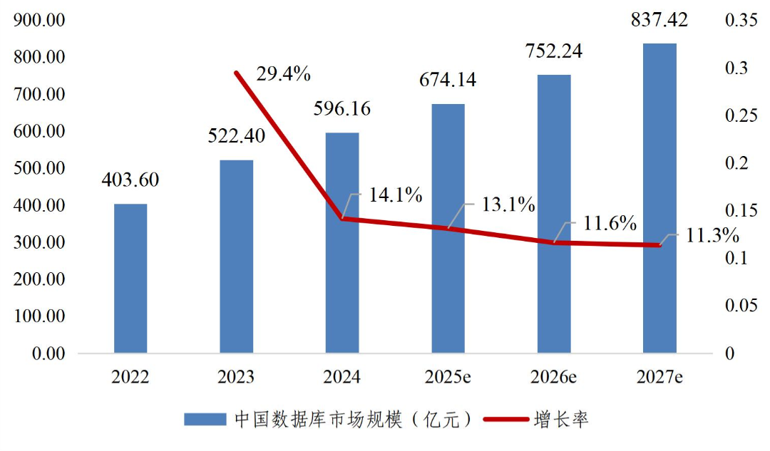 据测算,中国数据库市场规模为83.7亿美元,约合596.16亿元人民币,占全球7.3%。预计到2027年,中国数据库市场规模将达到837.42亿元,市场年复合增长率(CAGR)为11.99%。