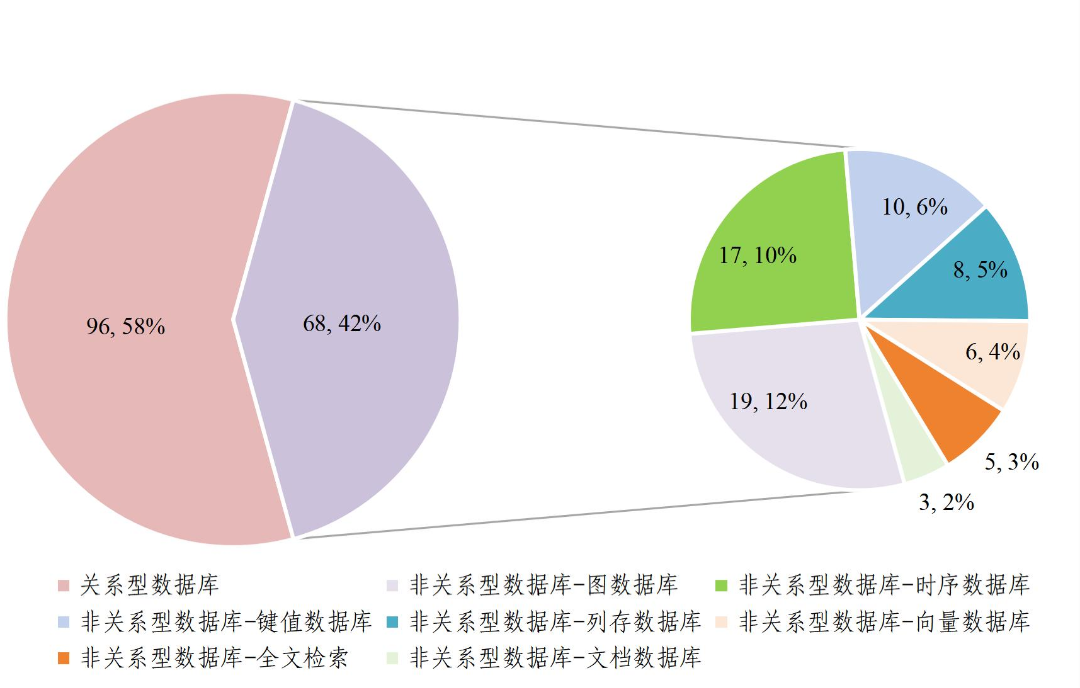 全球数据库产品数量整体分布呈现以非关系型及混合型数据库为主,关系型为辅的局面,键值数据库产品占比长期稳居第一。与全球不同,我国数据库产品数量仍呈现以关系型为主,非关系型数据库为辅的局面,向量数据库产品热度逐年攀升。