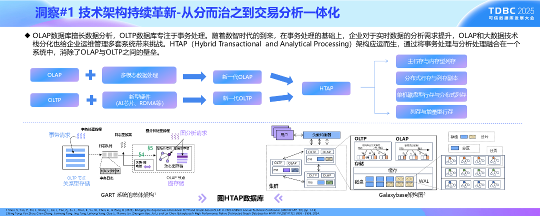 从分而治之到交易分析一体化。OLAP数据库擅长数据分析,OLTP数据库专注于事务处理。随着应用场景的变化和多系统带来的运维挑战,HTAP数据库架构应运而生。能够支持交易分析及图分析的图HTAP数据库也受到广泛关注。