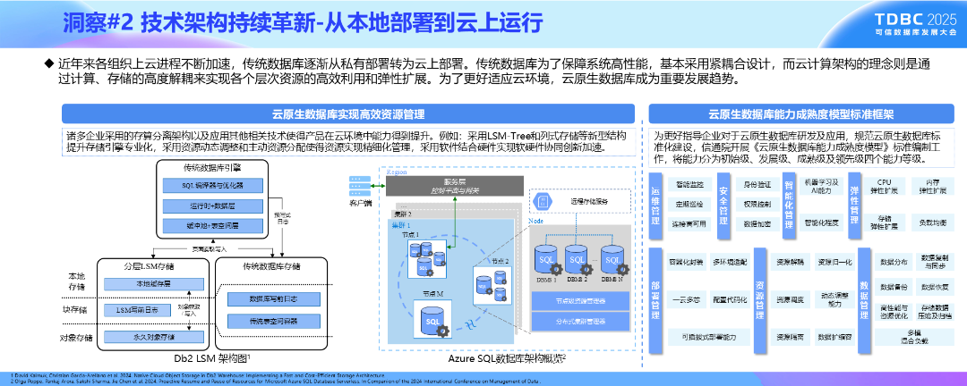 从本地部署到云上运行。近年来,传统数据库逐渐从私有部署转为云上部署。存算分离架构能够提高资源利用率并降低总体成本,从而得到了广泛应用。公有云服务商通过数据库自身架构优势提供更具有性价比的服务,而本地部署服务商通过主动资源分配等方式来实现云环境中数据库的高效资源管理。今年上半年,中国信通院完成了《云原生数据库能力成熟度模型》标准编制工作,将云原生数据库能力分为初始级、发展级、成熟级及领先级四个能力等级,更好指导企业对云原生数据库的研发及应用。
